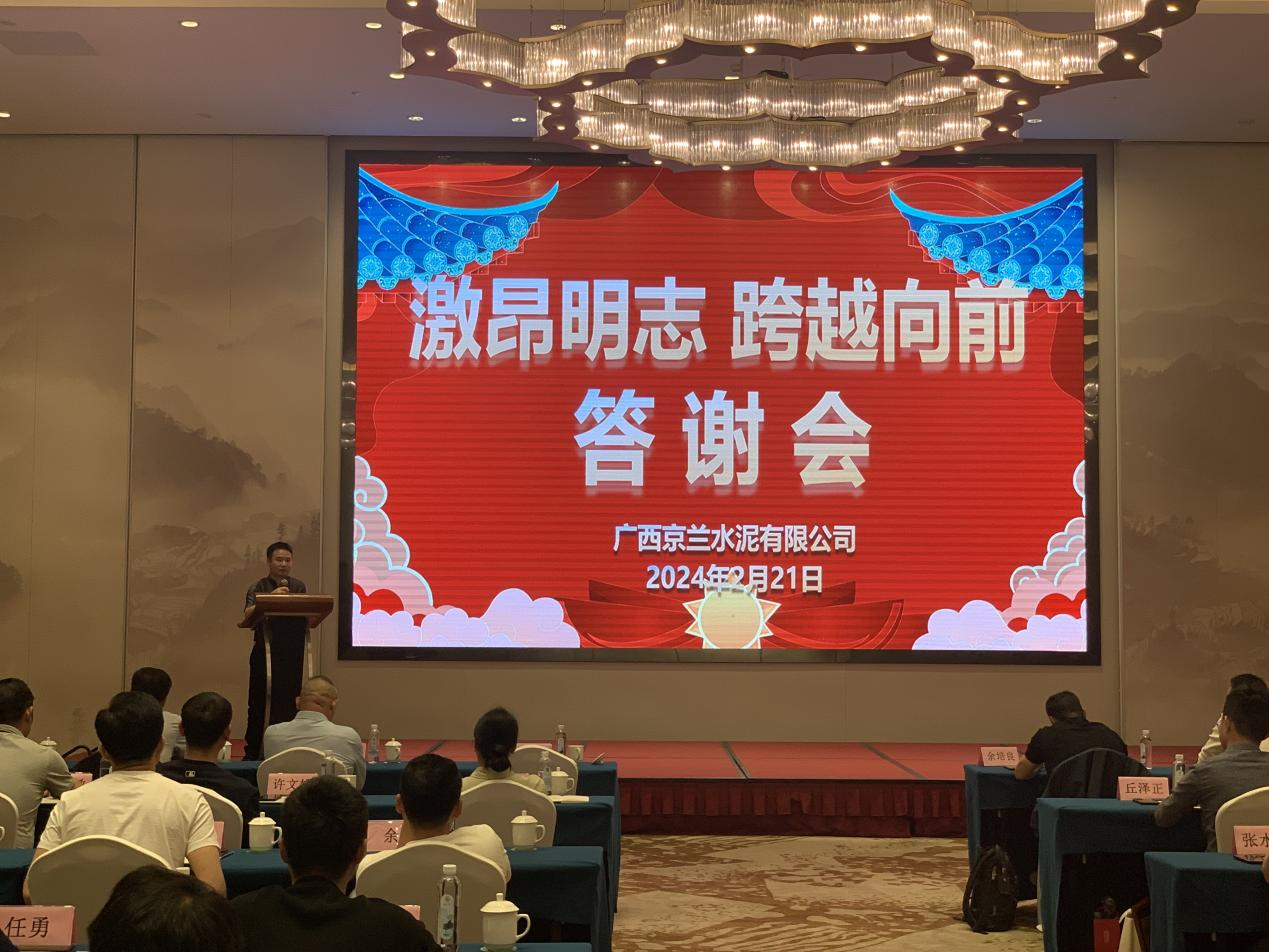 2024年2月21日,廣西京蘭水泥有限公司在柳州蓮花山莊召開以“激昂明志,跨越向前”為主題的2023年度代理商年終總結(jié)大會(huì)暨答謝會(huì),共有來自兩廣各地近20個(gè)地市、40余位合作代理商參加了本次盛會(huì),會(huì)議在熱情洋溢的氛圍中成功舉辦。
